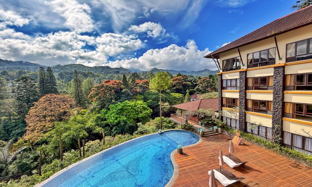 The hotel is situated on a hill which provides it with a spectacular view of Mount Salak. Feel the stress of daily life melts away as you relax in the infinity pool, explore the tranquil grounds surrounding the hotel, and enjoy the sunset view.